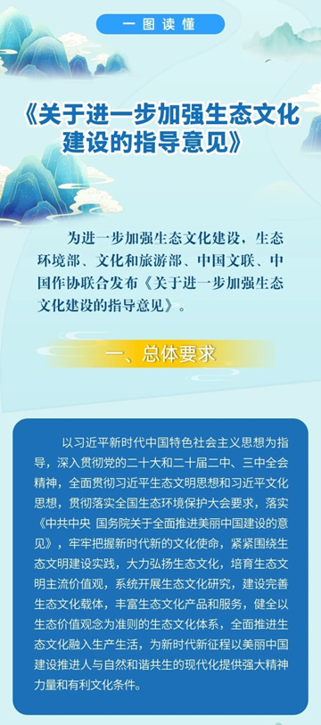 為深入學(xué)習(xí)貫徹落實(shí)習(xí)近平生態(tài)文明思想和習(xí)近平文化思想,進(jìn)一步加強(qiáng)生態(tài)文化建設(shè),近日,生態(tài)環(huán)境部、文化和旅游部、中國文聯(lián)、中國作協(xié)四部門聯(lián)合印發(fā)《關(guān)于進(jìn)一步加強(qiáng)生態(tài)文化建設(shè)的指導(dǎo)意見》(以下簡稱《意見》)。