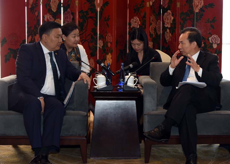 在會(huì)見(jiàn)策仁巴特時(shí),李干杰首先對(duì)蒙古國(guó)自然環(huán)境與旅游部加入“一帶一路”綠色發(fā)展國(guó)際聯(lián)盟表示贊賞。他說(shuō),在蒙古國(guó)自然環(huán)境與旅游部等中外合作伙伴的共同參與和推動(dòng)下,聯(lián)盟已有包括25個(gè)“一帶一路”共建國(guó)家環(huán)境部門(mén)在內(nèi)的近70個(gè)外方合作伙伴,成為“一帶一路”與“發(fā)展之路”倡議對(duì)接的重要載體之一。他指出,中蒙兩國(guó)是友好近鄰,在生態(tài)環(huán)境領(lǐng)域合作歷史已久,希望雙方以今年兩國(guó)建交70周年為契機(jī),推動(dòng)生態(tài)環(huán)境合作邁上新臺(tái)階。中方愿與蒙方分享大氣污染治理經(jīng)驗(yàn),深化荒漠化與沙塵暴聯(lián)合監(jiān)測(cè)與評(píng)估等方面合作,為雙方生態(tài)環(huán)境保護(hù)和可持續(xù)發(fā)展發(fā)揮積極作用。