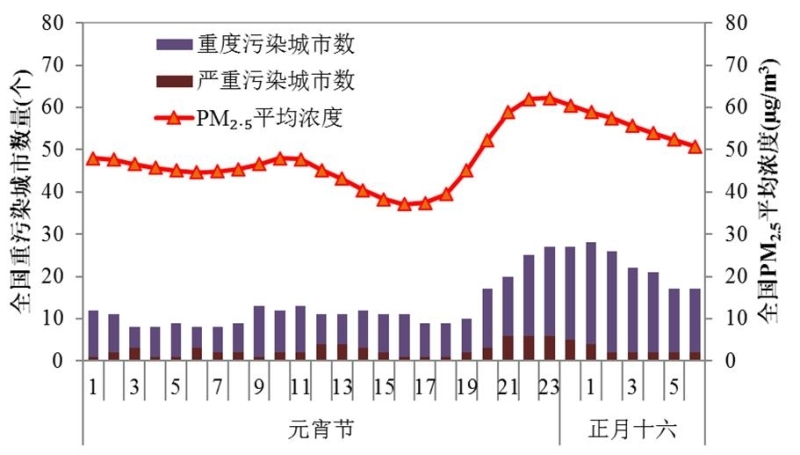 元宵節(jié)期間,全國339個(gè)地級及以上城市中,有24個(gè)城市空氣質(zhì)量達(dá)到重度及以上污染級別,其中7個(gè)城市達(dá)到嚴(yán)重污染級別。與前一日相比,重度污染和嚴(yán)重污染級別城市數(shù)量分別增加15個(gè)和5個(gè)。26日夜間,受煙花爆竹集中燃放影響,短時(shí)間內(nèi)PM2.5濃度出現(xiàn)快速上升。