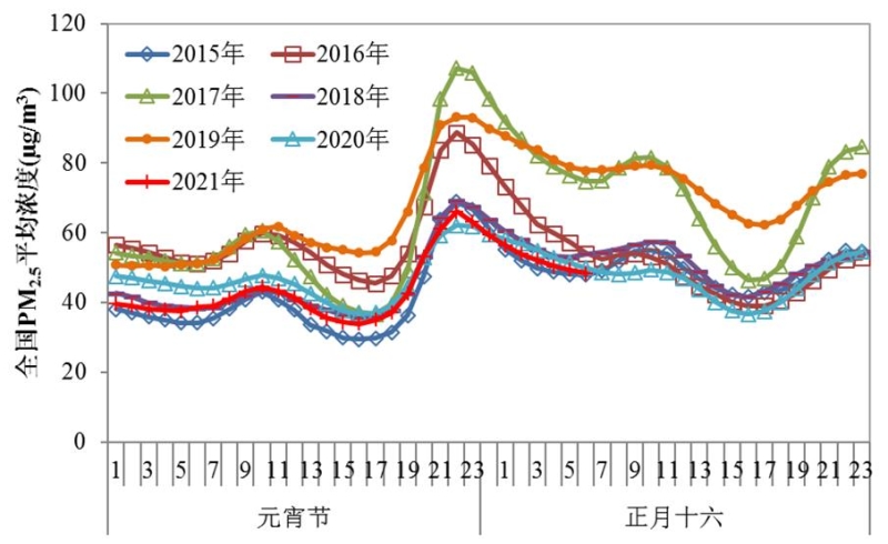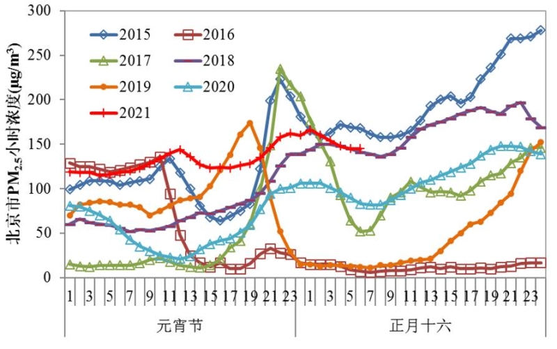 圖4 2015年至2021年元宵節(jié)至正月十六北京市逐小時(shí)PM2.5濃度