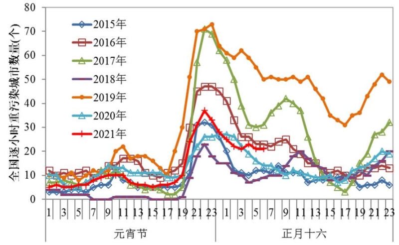 從近七年元宵節(jié)期間全國城市環(huán)境空氣質(zhì)量變化情況來看,受不利氣象條件和煙花爆竹燃放影響,2021年元宵節(jié)期間全國339個(gè)城市PM2.5最大小時(shí)平均濃度較去年元宵節(jié)最大值上升了6.5%,較近三年(2018-2020年)最大值的平均值下降了11.6%。峰值污染期間全國重污染城市數(shù)量較去年增加了10個(gè),較近三年平均重污染城市數(shù)量減少了4個(gè)。