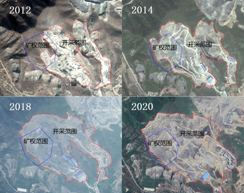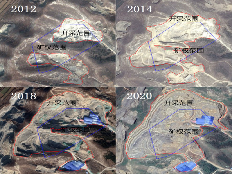 圖3 雙盛公司自開采以來生態(tài)破壞面積變化,藍色為礦權(quán)界、紅色為開采范圍