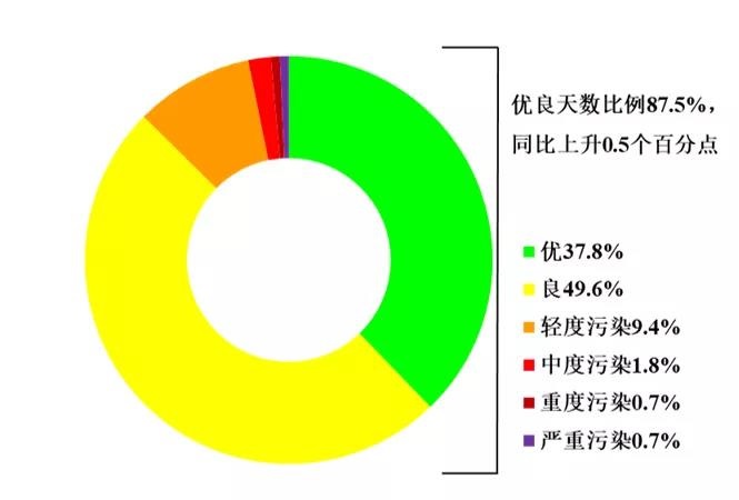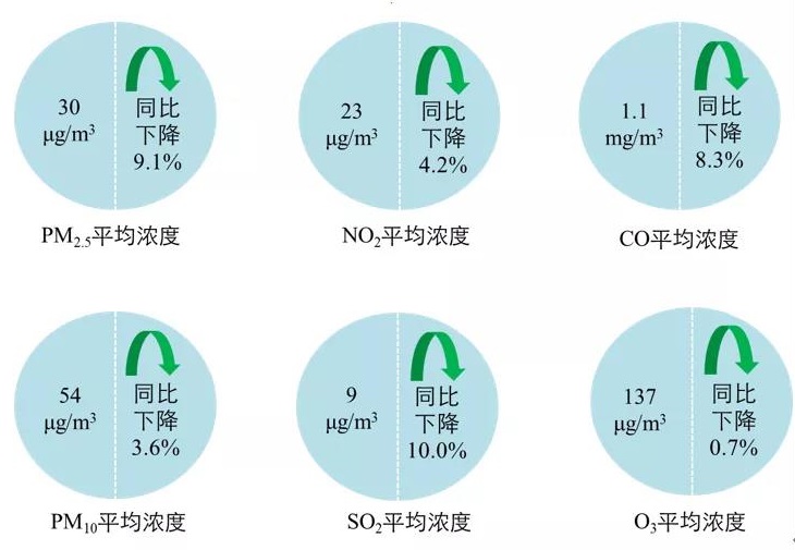 1-12月,全國339個地級及以上城市平均優(yōu)良天數(shù)比例為87.5%,同比上升0.5個百分點;PM2.5平均濃度為30微克/立方米,同比下降9.1%;PM10平均濃度為54微克/立方米,同比下降3.6%;O3平均濃度為137微克/立方米,同比下降0.7%;SO2平均濃度為9微克/立方米,同比下降10.0%;NO2平均濃度為23微克/立方米,同比下降4.2%;CO平均濃度為1.1毫克/立方米,同比下降8.3%。