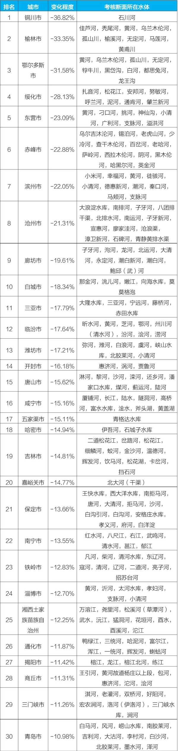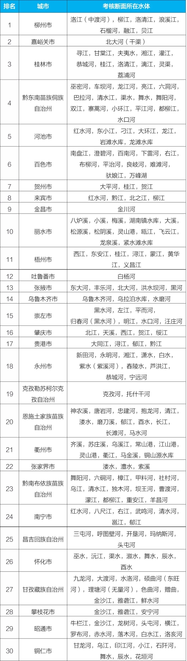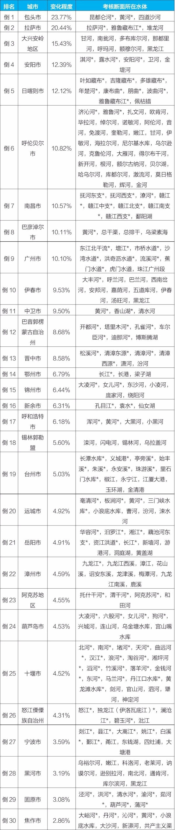 后30位城市及所在水體