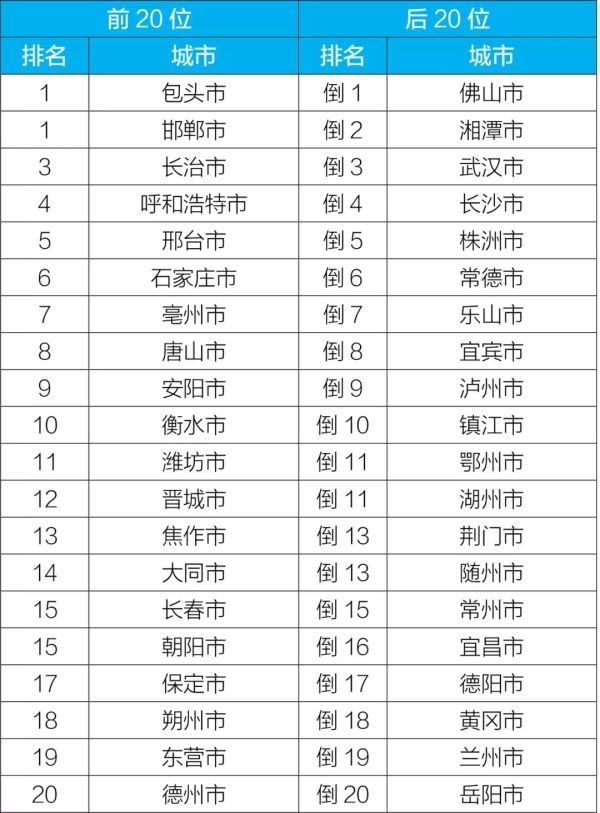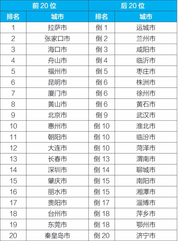 前20位和后20位城市名單
