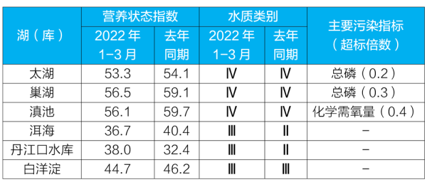 1-3月,監(jiān)測(cè)的192個(gè)重點(diǎn)湖(庫)中,水質(zhì)優(yōu)良(Ⅰ~Ⅲ類)湖庫個(gè)數(shù)占比78.1%,同比上升2.7個(gè)百分點(diǎn);劣Ⅴ類水質(zhì)湖庫個(gè)數(shù)占比4.7%,同比上升1.0個(gè)百分點(diǎn)。主要污染指標(biāo)為總磷、化學(xué)需氧量和高錳酸鹽指數(shù)。176個(gè)監(jiān)測(cè)營養(yǎng)狀態(tài)的湖(庫)中,中度富營養(yǎng)8個(gè),占4.5%;輕度富營養(yǎng)32個(gè),占18.2%;其余湖(庫)為中營養(yǎng)或貧營養(yǎng)狀態(tài)。其中,太湖和巢湖均為輕度污染、輕度富營養(yǎng),主要污染指標(biāo)為總磷;滇池為輕度污染、輕度富營養(yǎng),主要污染指標(biāo)為化學(xué)需氧量;洱海、丹江口水庫和白洋淀水質(zhì)均良好、中營養(yǎng)。