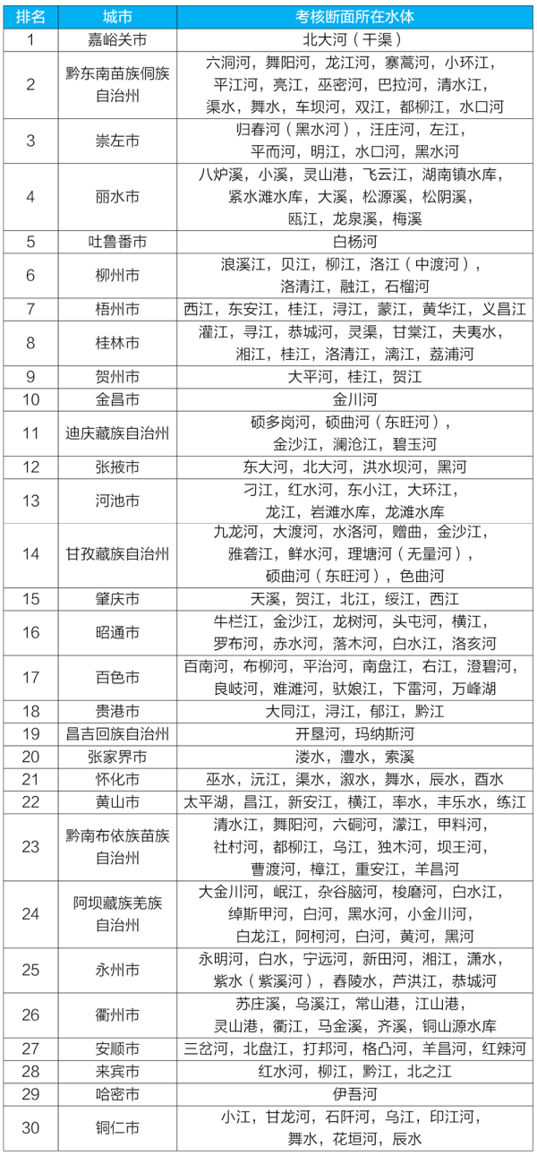 水環(huán)境質(zhì)量狀況排名前30位城市及所在水體