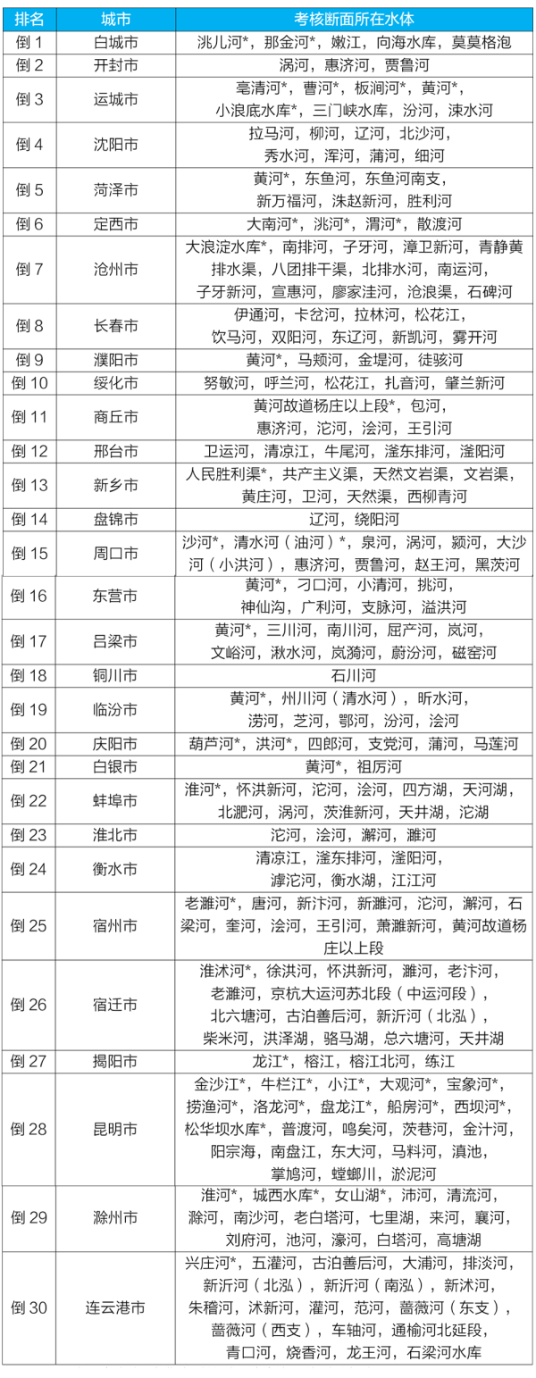 水環(huán)境質(zhì)量狀況排名后30位城市及所在水體