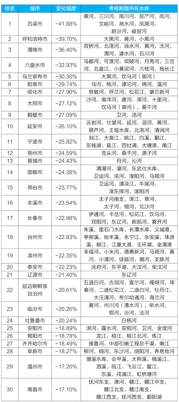 質(zhì)量變化情況排名前30位城市及所在水體