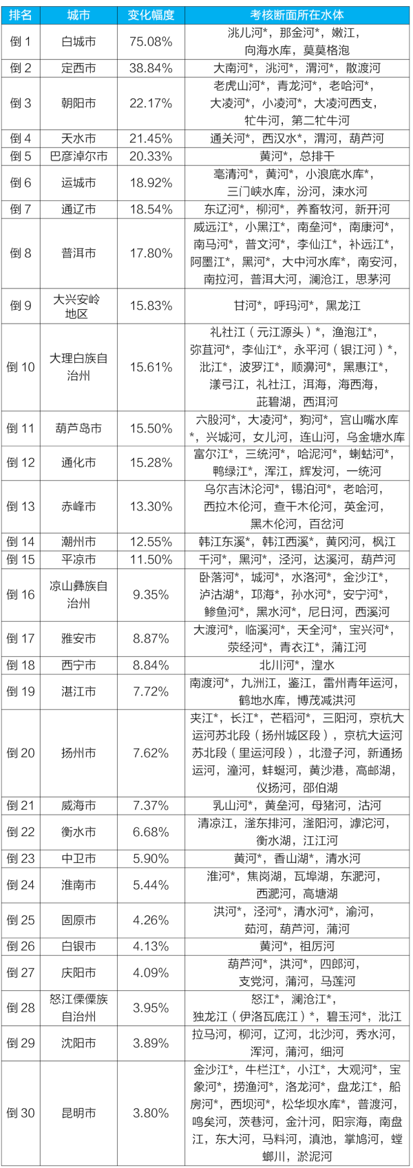 質(zhì)量變化情況排名后30位城市及所在水體