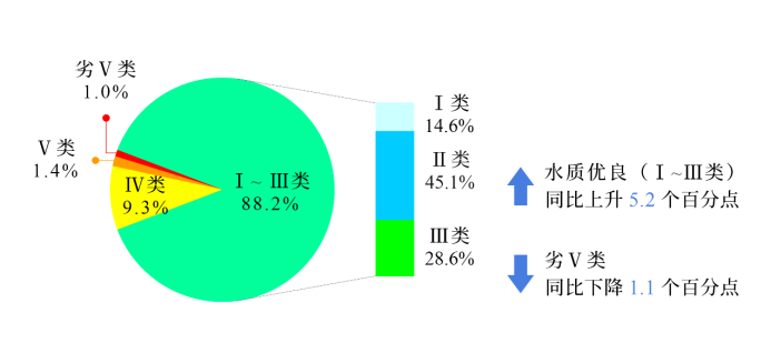 1-3月,3641個(gè)國家地表水考核斷面中,水質(zhì)優(yōu)良(Ⅰ~Ⅲ類)斷面比例為88.2%,同比上升5.2個(gè)百分點(diǎn);劣Ⅴ類斷面比例為1.0%,同比下降1.1個(gè)百分點(diǎn)。主要污染指標(biāo)為化學(xué)需氧量、總磷和高錳酸鹽指數(shù)。