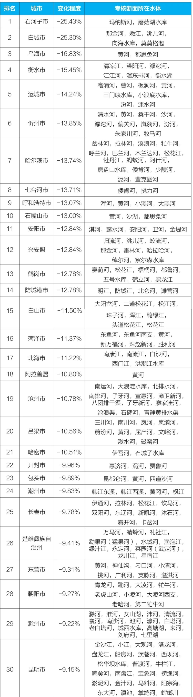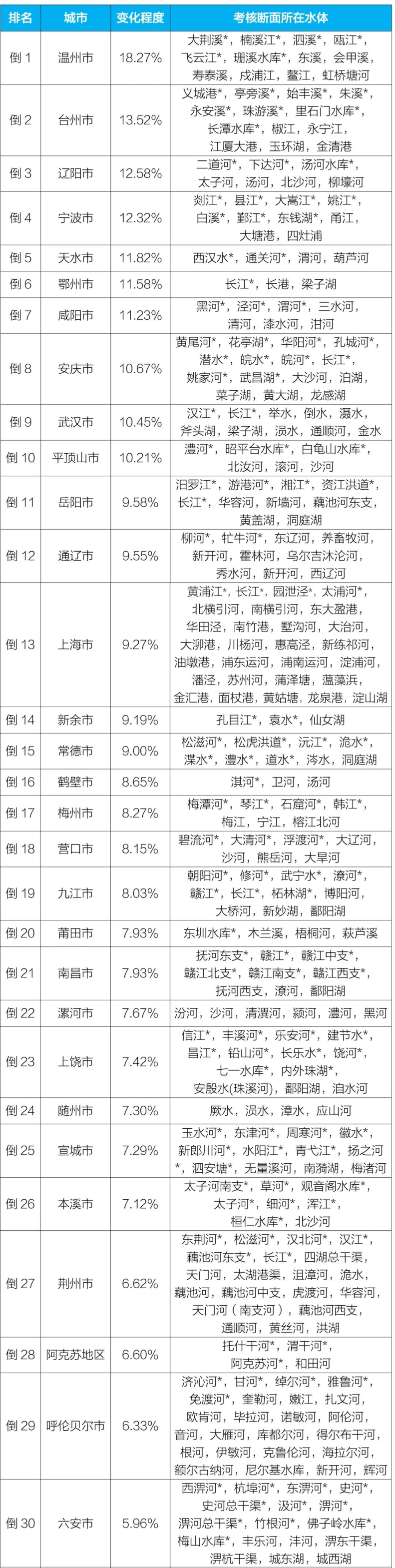 2023年1—6月國家地表水考核斷面水環(huán)境質(zhì)量變化情況排名前30位城市及所在水體