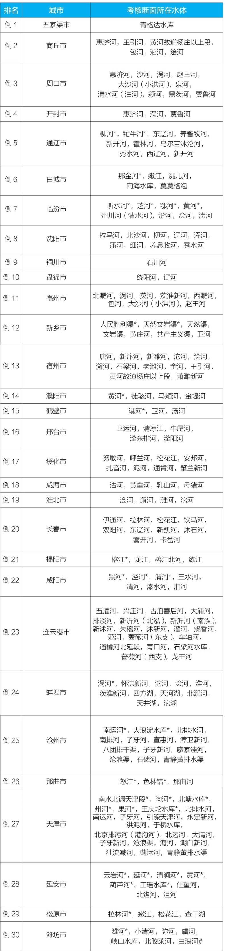 2023年1—6月國家地表水考核斷面水環(huán)境質(zhì)量狀況排名后30位城市及所在水體