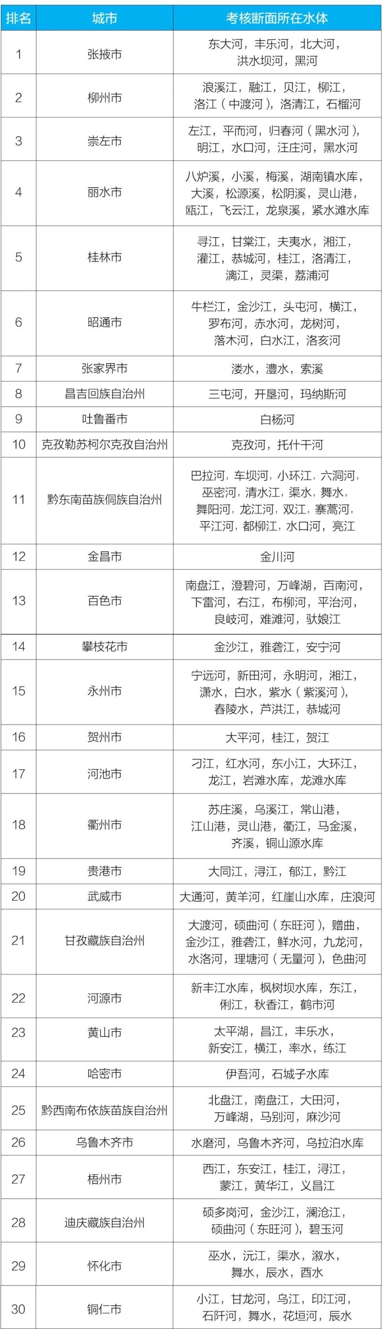 1—6月,全國地級(jí)及以上城市中,張掖市、柳州市和崇左市等30個(gè)城市國家地表水考核斷面水環(huán)境質(zhì)量相對(duì)較好(從第1名至第30名),五家渠市、商丘市和周口市等30個(gè)城市國家地表水考核斷面水環(huán)境質(zhì)量相對(duì)較差(從倒數(shù)第1名至倒數(shù)第30名),見附表1—2。