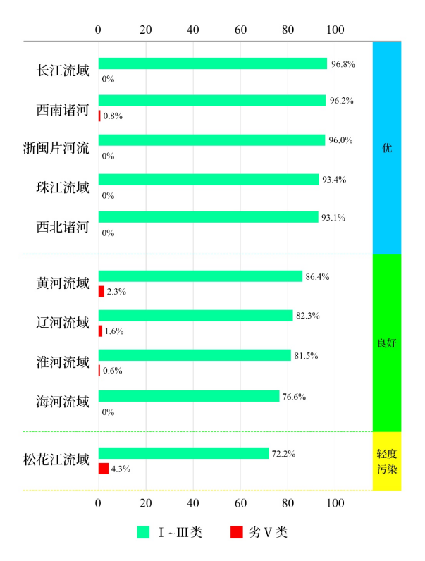 1—6月,長江、黃河、珠江、松花江、淮河、海河、遼河等七大流域及西北諸河、西南諸河和浙閩片河流水質(zhì)優(yōu)良(Ⅰ—Ⅲ類)斷面比例為89.1%,同比上升1.8個(gè)百分點(diǎn);劣Ⅴ類斷面比例為0.7%,同比下降0.1個(gè)百分點(diǎn)。主要污染指標(biāo)為化學(xué)需氧量、高錳酸鹽指數(shù)和五日生化需氧量。其中,長江流域、西南諸河、浙閩片河流、珠江流域和西北諸河水質(zhì)為優(yōu);黃河、遼河、淮河和海河流域水質(zhì)良好;松花江流域?yàn)檩p度污染。
