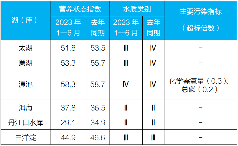 1—6月,監(jiān)測的208個(gè)重點(diǎn)湖(庫)中,水質(zhì)優(yōu)良(Ⅰ—Ⅲ類)湖庫個(gè)數(shù)占比80.3%,同比上升4.1個(gè)百分點(diǎn);劣Ⅴ類水質(zhì)湖庫個(gè)數(shù)占比5.3%,同比上升0.1個(gè)百分點(diǎn)。主要污染指標(biāo)為總磷、化學(xué)需氧量和高錳酸鹽指數(shù)。204個(gè)監(jiān)測營養(yǎng)狀態(tài)的湖(庫)中,中度富營養(yǎng)的6個(gè),占2.9%;輕度富營養(yǎng)的39個(gè),占19.1%;其余湖(庫)為中營養(yǎng)或貧營養(yǎng)狀態(tài)。其中,太湖和巢湖水質(zhì)均良好、輕度富營養(yǎng);滇池為輕度污染、輕度富營養(yǎng),主要污染指標(biāo)為化學(xué)需氧量和總磷;洱海水質(zhì)為優(yōu)、中營養(yǎng);丹江口水庫水質(zhì)為優(yōu)、貧營養(yǎng);白洋淀水質(zhì)良好、中營養(yǎng)。