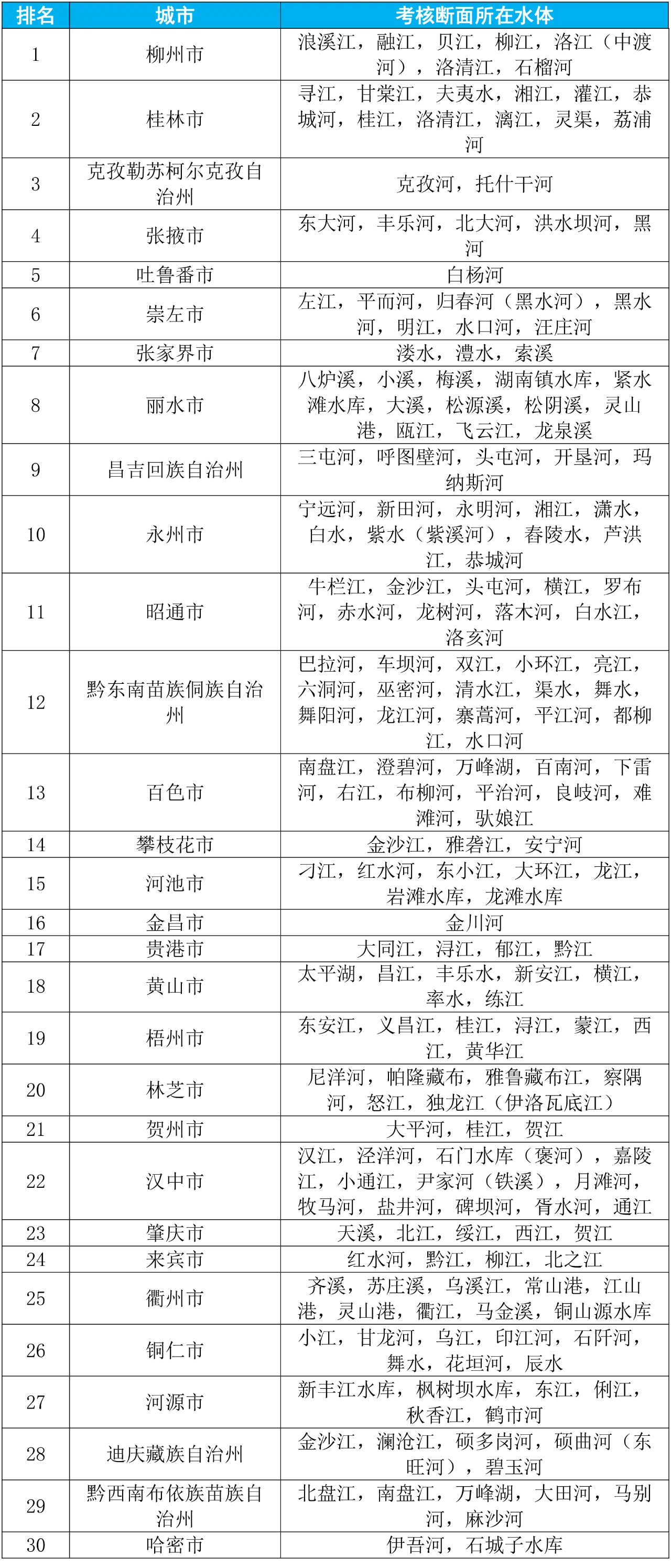 2023年1—9月國家地表水考核斷面水環(huán)境質(zhì)量狀況排名前30位城市及所在水體