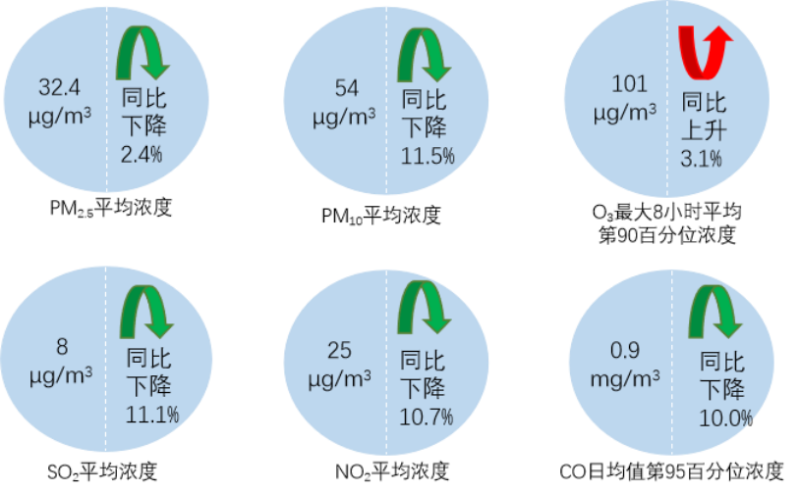 11月,全國339個(gè)地級及以上城市PM2.5平均濃度為32.4微克/立方米,同比下降2.4%;PM10平均濃度為54微克/立方米,同比下降11.5%;O3平均濃度為101微克/立方米,同比上升3.1%;SO2平均濃度為8微克/立方米,同比下降11.1%;NO2平均濃度為25微克/立方米,同比下降10.7%;CO平均濃度為0.9毫克/立方米,同比下降10.0%。