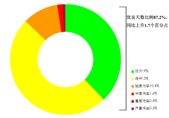 1—12月,全國339個(gè)地級(jí)及以上城市平均空氣質(zhì)量?jī)?yōu)良天數(shù)比例為87.2%,同比上升1.7個(gè)百分點(diǎn);平均重度及以上污染天數(shù)比例為0.9%,同比下降0.7個(gè)百分點(diǎn)。由沙塵天氣導(dǎo)致的平均超標(biāo)天數(shù)比例為1.9%,其中重度及以上污染天數(shù)比例為0.4%。