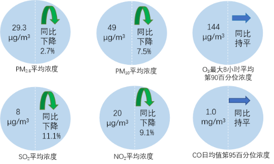 1—12月,全國339個(gè)地級(jí)及以上城市PM2.5平均濃度為29.3微克/立方米,同比下降2.7%;PM10平均濃度為49微克/立方米,同比下降7.5%;O3平均濃度為144微克/立方米,同比持平;SO2平均濃度為8微克/立方米,同比下降11.1%;NO2平均濃度為20微克/立方米,同比下降9.1%;CO平均濃度為1.0毫克/立方米,同比持平。