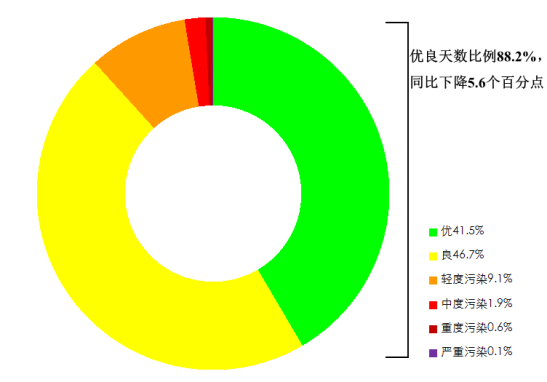 11月,全國339個(gè)地級及以上城市平均空氣質(zhì)量優(yōu)良天數(shù)比例為88.2%,同比下降5.6個(gè)百分點(diǎn);平均重度及以上污染天數(shù)比例為0.7%,同比上升0.4個(gè)百分點(diǎn)。由沙塵天氣導(dǎo)致的平均超標(biāo)天數(shù)比例為5.3%,其中重度及以上污染天數(shù)比例為0.3%。