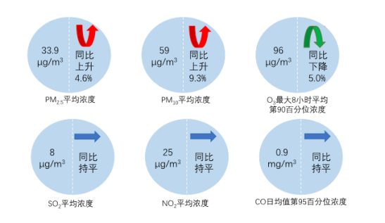 11月,全國339個(gè)地級及以上城市PM2.5平均濃度為33.9微克/立方米,同比上升4.6%;PM10平均濃度為59微克/立方米,同比上升9.3%;O3平均濃度為96微克/立方米,同比下降5.0%;SO2平均濃度為8微克/立方米,同比持平;NO2平均濃度為25微克/立方米,同比持平;CO平均濃度為0.9毫克/立方米,同比持平。