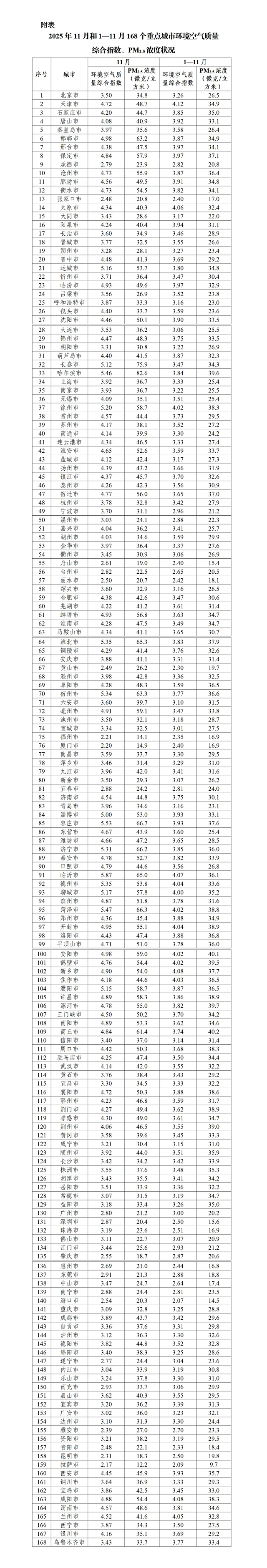11月和1—11月168個(gè)重點(diǎn)城市環(huán)境空氣質(zhì)量綜合指數(shù)、PM2.5濃度狀況詳見附表。
