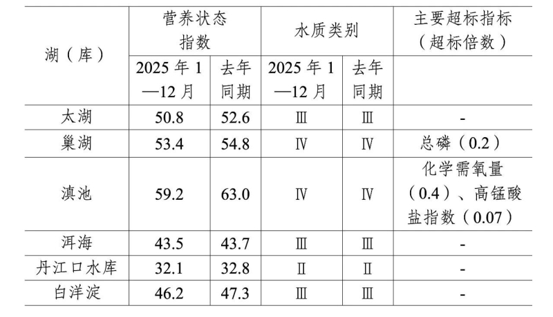 第四季度,監(jiān)測(cè)的208個(gè)重點(diǎn)湖(庫(kù))中,水質(zhì)優(yōu)良(Ⅰ—Ⅲ類)湖庫(kù)個(gè)數(shù)占比76.9%,同比上升5.1個(gè)百分點(diǎn);劣Ⅴ類水質(zhì)湖庫(kù)個(gè)數(shù)占比2.9%,同比下降1.4個(gè)百分點(diǎn)。主要超標(biāo)指標(biāo)為總磷、化學(xué)需氧量和高錳酸鹽指數(shù)。202個(gè)監(jiān)測(cè)營(yíng)養(yǎng)狀態(tài)的湖(庫(kù))中,中度富營(yíng)養(yǎng)的4個(gè),占2.0%;輕度富營(yíng)養(yǎng)的51個(gè),占25.2%;其余湖(庫(kù))為中營(yíng)養(yǎng)或貧營(yíng)養(yǎng)狀態(tài)。其中,太湖水質(zhì)良好、輕度富營(yíng)養(yǎng);巢湖為輕度污染、輕度富營(yíng)養(yǎng),主要超標(biāo)指標(biāo)為總磷;滇池為輕度污染、輕度富營(yíng)養(yǎng),主要超標(biāo)指標(biāo)為化學(xué)需氧量;洱海、丹江口水庫(kù)和白洋淀水質(zhì)良好、中營(yíng)養(yǎng)。