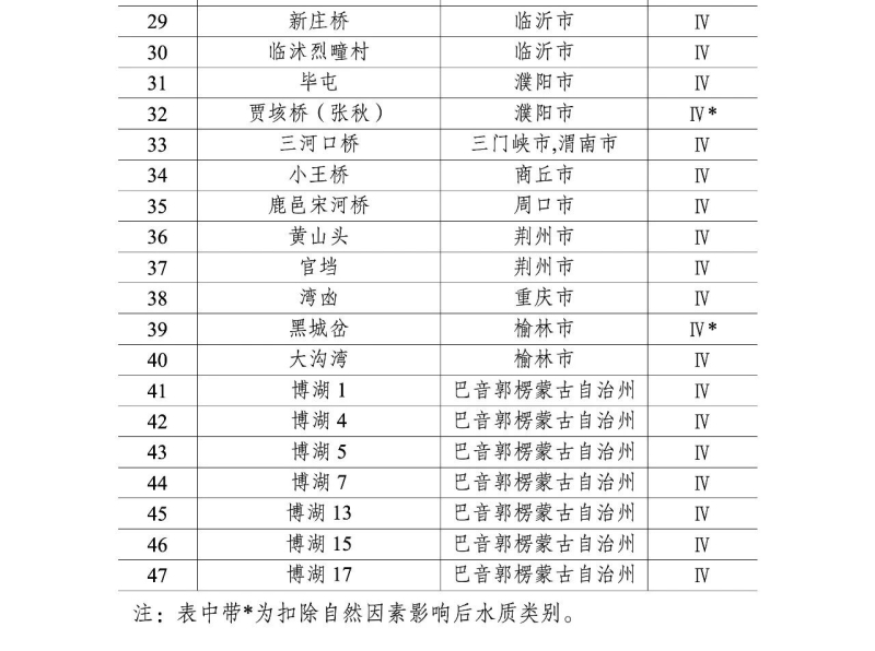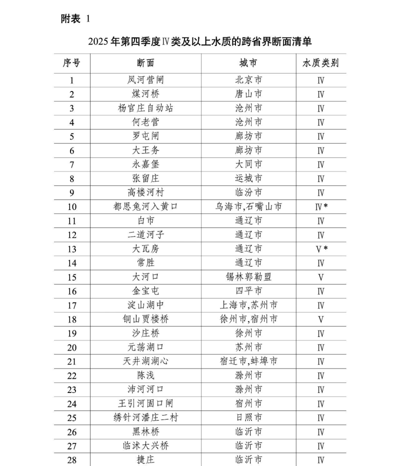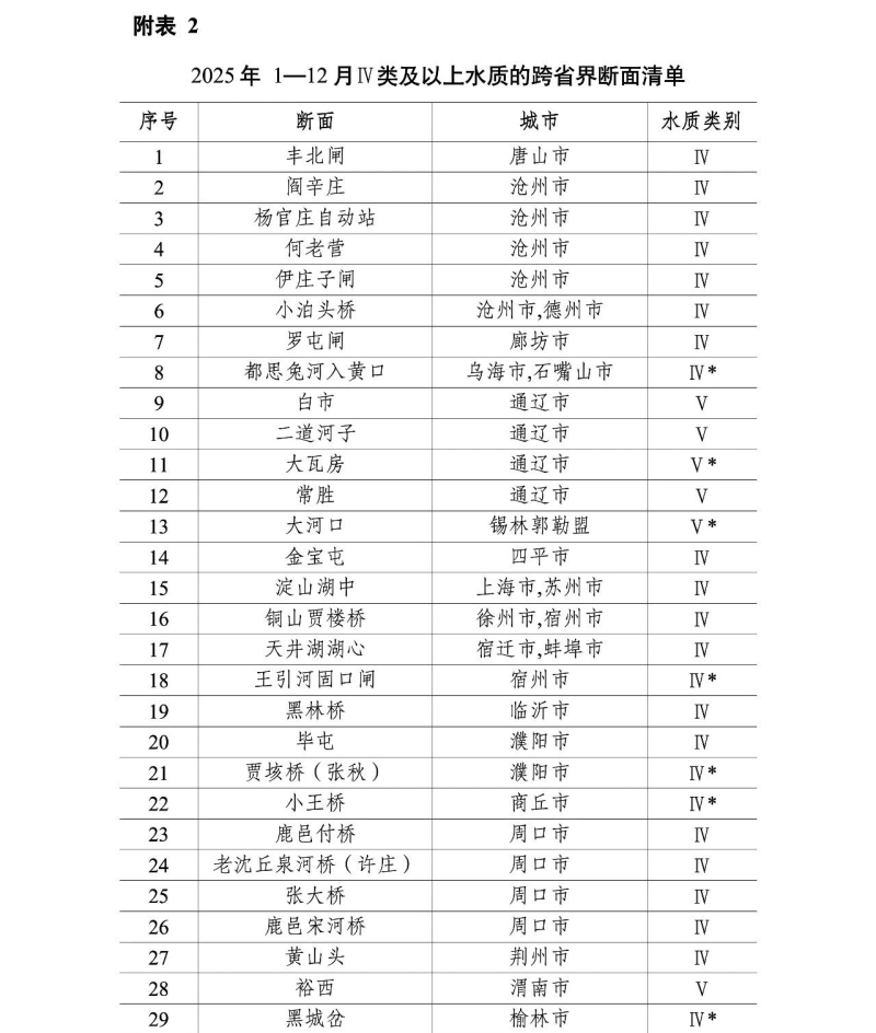 Ⅳ類及以上水質(zhì)的跨省界斷面清單