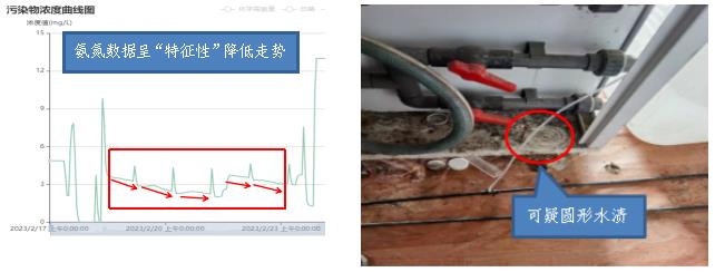2月24日,調(diào)查組對該公司開展現(xiàn)場檢查,經(jīng)檢查自動監(jiān)測設(shè)備,發(fā)現(xiàn)從2月23日21:00左右起,氨氮自動監(jiān)測濃度數(shù)據(jù)由達標急速變化至超標,疑似人為調(diào)整自動監(jiān)測設(shè)備運行狀態(tài),且氨氮自動監(jiān)測設(shè)備后方采樣管線附近存在一處“圓形水漬”,疑似長時間放置“水瓶”所致。經(jīng)調(diào)取門崗視頻監(jiān)控,發(fā)現(xiàn)23日當晚有車輛進出廠區(qū),與數(shù)據(jù)異常時段吻合。調(diào)查組立即啟動與公安部門聯(lián)合辦案機制,公安部門提前介入,經(jīng)調(diào)閱被查扣車輛行車記錄儀,獲取如下通話記錄信息:“老許(總經(jīng)理)打電話了,讓測實數(shù),把瓶撤了……”經(jīng)查實,該公司因擔心出水超標,采用調(diào)配合格的水樣裝入水瓶代替實際水樣進行檢測,篡改COD、氨氮等污染物自動監(jiān)測數(shù)據(jù),并通過超越管線將泥水混合物通過污水排放口排入河道長達40分鐘,最終導致下游國考斷面水質(zhì)超標報警。
