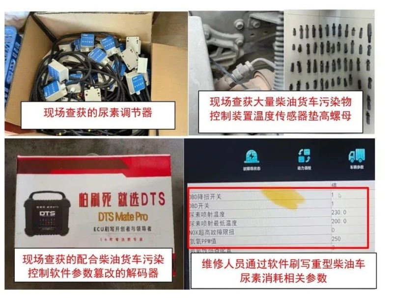 棗莊市公安局聯(lián)合生態(tài)環(huán)境局組成專案組,先后赴3省5市,進(jìn)一步圍繞作弊軟、硬件生產(chǎn)環(huán)節(jié)進(jìn)行溯源排查。查獲廣東深圳、北京等兩個(gè)軟件公司生產(chǎn)銷售刷機(jī)軟件,可屏蔽重型柴油貨車尿素噴射異常信號,幫助車輛規(guī)避使用污染控制裝置。同時(shí),還查獲河北滄州某公司制作銷售尿素調(diào)節(jié)器。經(jīng)排查,近4000個(gè)汽車維修站使用作弊軟硬件,涉及重型柴油車6000余輛。